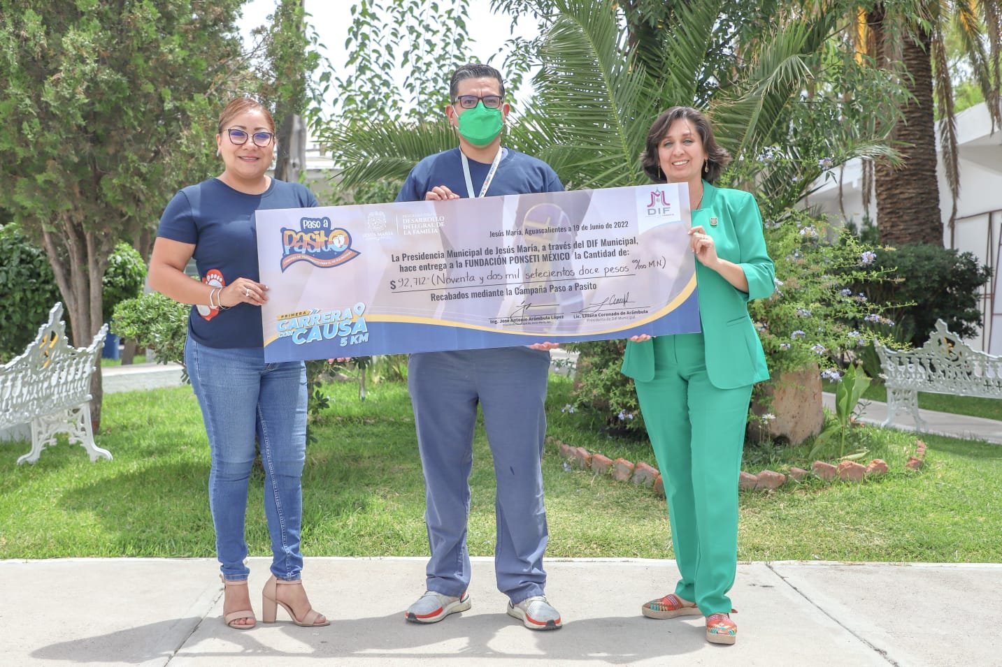 La presidenta del Sistema DIF Municipal, Liliana Coronado de Arámbula, llevó a cabo la entrega del dinero recaudado por las actividades de la campaña Paso a Pasito, para apoyar a niñas y niños con Pie Equinovaro, a la Fundación Ponseti Aguascalientes.