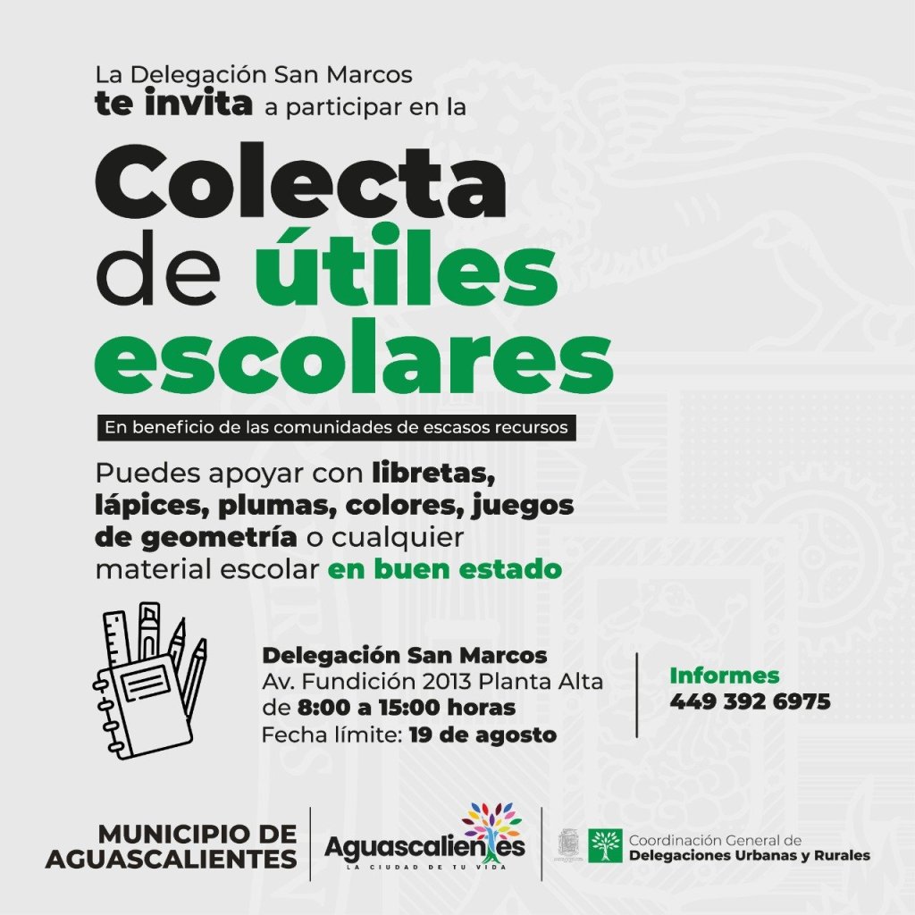 La Presidencia Municipal continúa trabajando en el crecimiento y desarrollo óptimo de niños y jóvenes, apoyándolos en su preparación estudiantil con recursos y materiales que faciliten su aprendizaje. El titular de la Delegación San Marcos, Roberto Domínguez Lara, invita a la ciudadanía a participar en la “Colecta de Útiles Escolares” a favor de comunidades de escasos recursos.