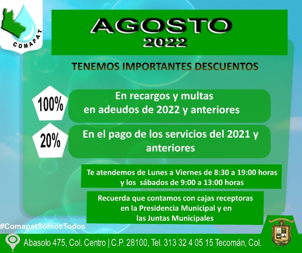“La Comisión de Agua Potable y Alcantarillado del Municipio de Tecomán (COMAPAT), está otorgando durante este mes de agosto, importantes descuentos en beneficio de los usuarios del organismo operador”.