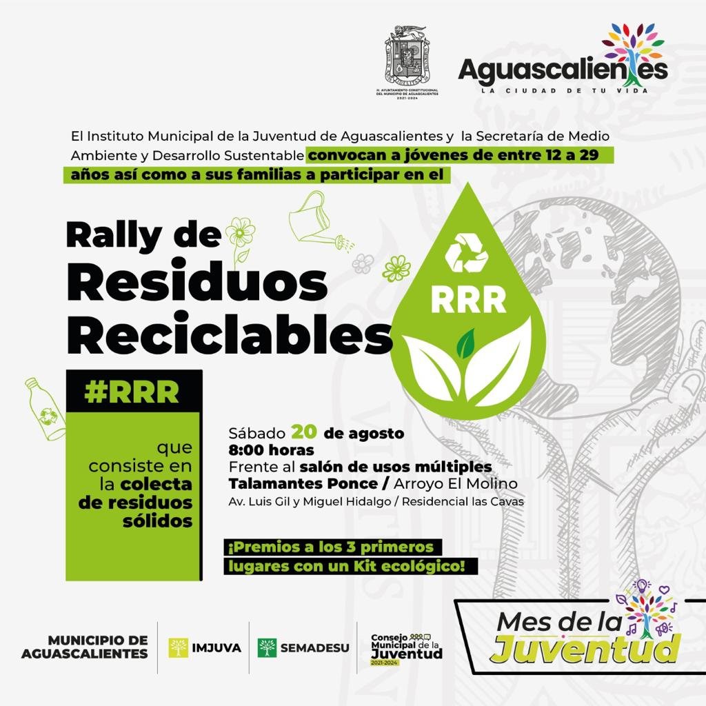 ♻️✅ La Presidencia Municipal a través del Instituto Municipal de la Juventud de Aguascalientes así como la Secretaría de Medio Ambiente y Desarrollo Sustentable, invita a los jóvenes de entre 12 y 29 años de edad a ser parte del «Rally de Residuos Reciclables» que se llevará a cabo el:
