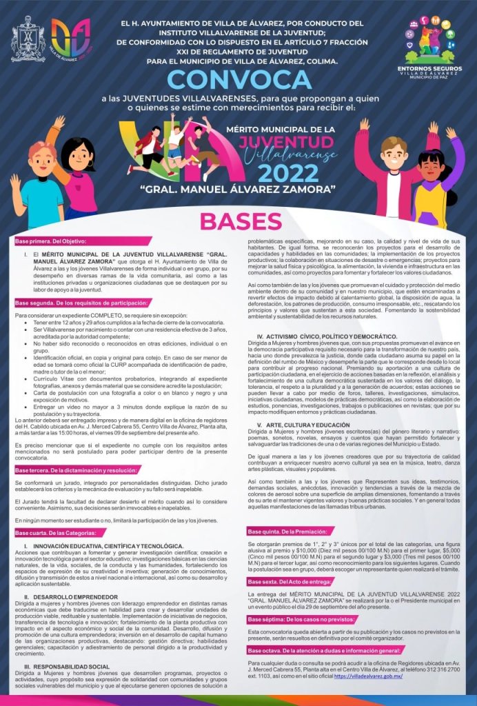 Ambas convocatorias, la del Primer Cabildo Juvenil Villa de Álvarez 2022 y la del Mérito Municipal de la Juventud Villalvarense “Gral. Manuel Álvarez Zamora”, están disponibles para su consulta en la página web http://www.villadealvarez.gob.mx y en la página de Facebook del Ayuntamiento de Villa de Álvarez.