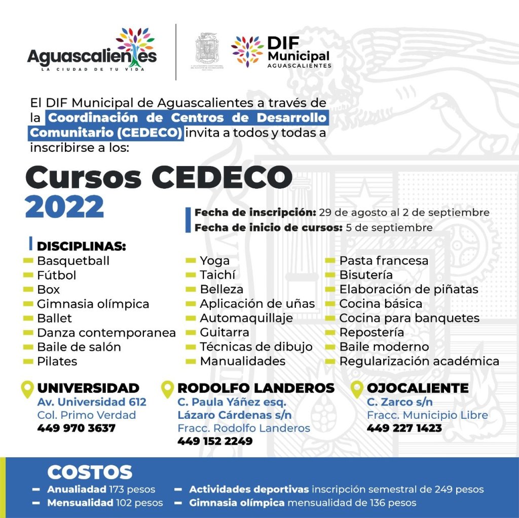 El DIF Municipal de Aguascalientes, a través de la Coordinación de Desarrollo Familiar y Comunitario (CEDECO), abre sus inscripciones del 29 del agosto al 02 de septiembre para los cursos del periodo agosto-diciembre del 2022, en los centros Universidad, Rodolfo Landeros y Ojocaliente.