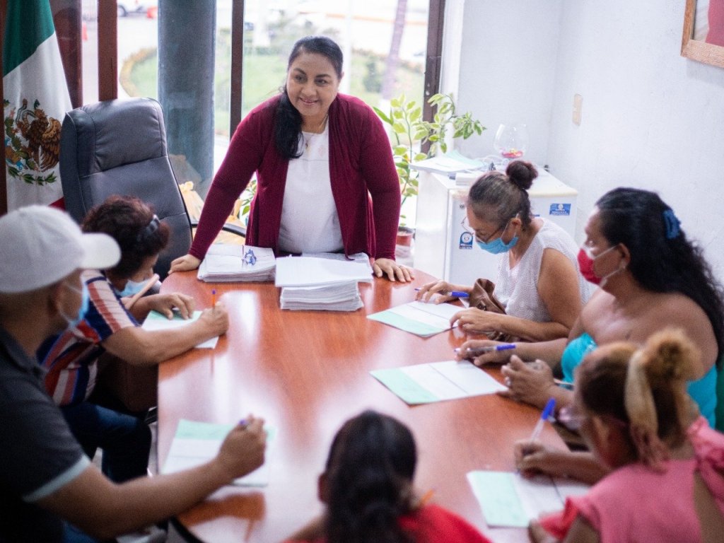 En sala de juntas, la alcaldesa recibió a la gente a quien ayudó al llenado de la documentación requerida por la dirección de Desarrollo Social, pues de esta dependencia del Ayuntamiento de Manzanillo es el presupuesto para el Programa de Apoyo a Grupos Vulnerables.