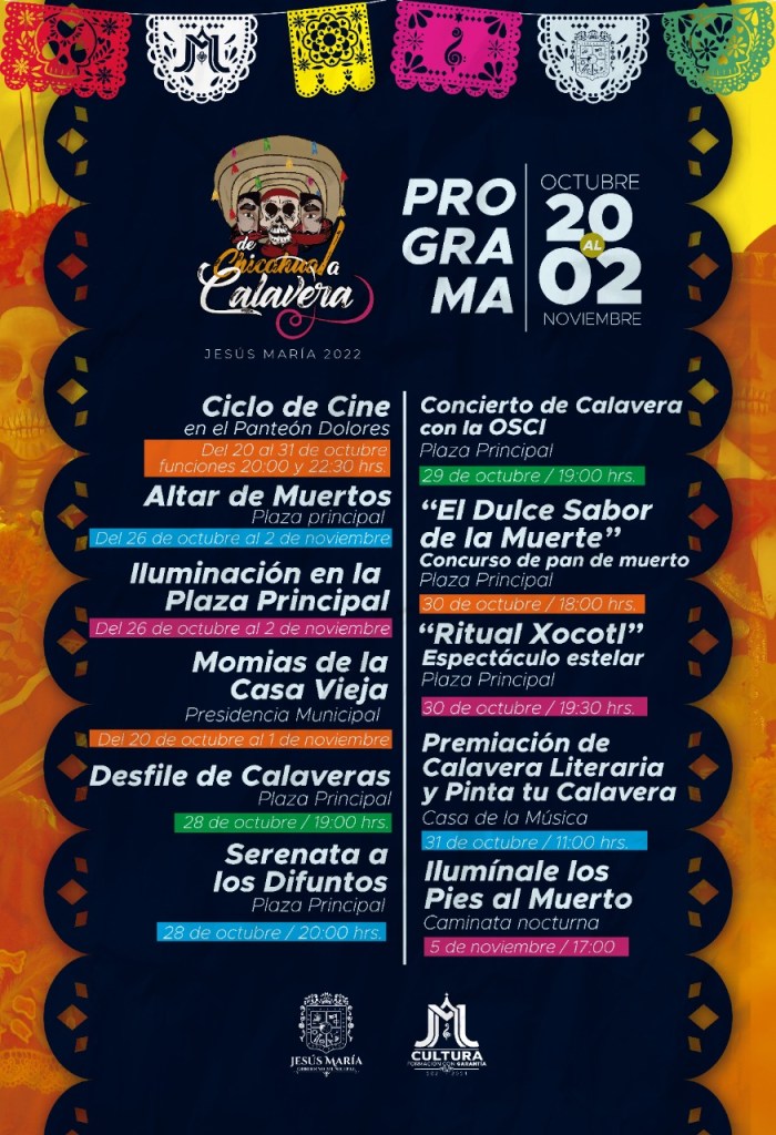 El programa general contempla una gran variedad de actividades ya arraigadas pero también otras propuestas para el disfrute de los jesusmarienses, tales como el ciclo de cine en el Panteón Dolores (20- 31 de octubre); la colocación del altar de muertos en la Plaza Principal junto con una iluminación alusiva a la fecha (26 octubre- 2 de noviembre). En tanto en el Palacio Municipal, se contará con una exhibición de “Momias de la Casa Vieja”.