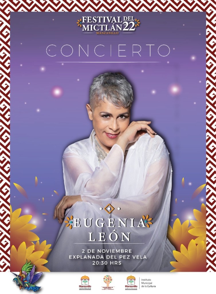 Es de mencionar que Eugenia León, ganadora en 1985 del primer lugar del Festival OTI en Sevilla, España, suma a su carrera más de 35 años de trayectoria con 26 discos grabados y se ha presentado en escenarios como el Palacio de Bellas Artes, la Sala Nezahualcóyotl; también lo ha hecho en Estados Unidos como en Nueva York, Washington, Los Ángeles y Houston, y en otros países como China, Egipto, Marruecos, España, Colombia, Chile.Agregó que, el lunes 31 de octubre, en la comunidad de Canoas, se instalarán y evaluarán altares comunitarios, donde además se presentará la obra teatral, “El Aullido de la llorona” del movimiento cultural alternativo, a las 8 de la noche; estas mismas actividades se realizarán el 01 de noviembre, pero en la explanada del Pez Vela. Indicó también que, desde el viernes 28 de octubre, alrededor de 60 artesanos del sur del país harán la Expo Artesanal Mundo Maya en la Plaza Juárez, ahí se podrán encontrar artesanías y exposiciones de la cultura nacional, así como diversas ceremonias, espectáculos de corte prehispánico y estará montada hasta el 06 de noviembre, desde las 10 de la mañana hasta 10 de la noche “vienen con una exposición de ámbar”. En su intervención, la directora del Instituto Municipal de las Mujeres, Verónica Solís y el director de Educación y Personas Jóvenes, Carlos Luna dieron a conocer la convocatoria al Primer Concurso de Catrinas, en donde invitaron a todas las mujeres y personas que se identifiquen como tal a participar, esta convocatoria puede conocerse en el siguiente enlace: https://bit.ly/concursocatrinasMZO2022 La alcaldesa dijo que dentro de las actividades programadas también para el miércoles 02 de noviembre, se encuentra en la lista los se desarrollará la caminata de “Las Catrinas” a las 6 de la tarde que recorrerá la avenida México hasta llegar a la explanada del Pez Vela momento en qué iniciará el concurso para reconocer la participación de la población involucrada, y ese mismo día y lugar será la sede para el concierto de Eugenia León que comenzará a las 8:30 de la noche, “terminando, a las 12 de la noche habrá Cuentos y leyendas de Manzanillo en el Panteón María Teresa S. Escobar, si quiere participar puede contar su cuento de terror”. Dijo que el domingo 06 de noviembre se realizará la premiación de los Altares Comunitarios y del Concurso de Catrinas en la explanada del Pez Vela.