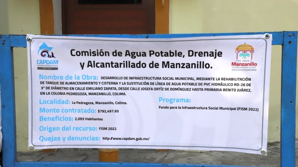 Junto con el director general de la Comisión de Agua Potable, Drenaje y Alcantarillado de Manzanillo (CAPDAM), Leonardo Chiprés y el director de Construcción del organismo operador, Juan Álvarez Echave, la alcaldesa destacó que, con esta obra, que forma parte de las 300 que entregarán en este año, se beneficiarán de manera directa 2 mil 93 habitantes.