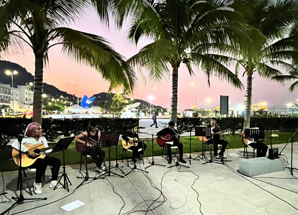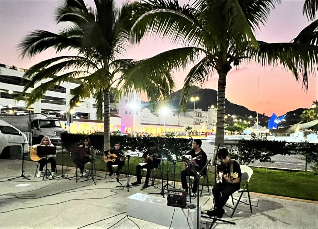 Bajo la dirección de sus maestros Luany y Christian Fabián Lugo, los jóvenes músicos: Natalia, Christian, Jordan Carlos y Jafeth, alumnos del Taller de Guitarra Popular Intermedio del Instituto Municipal de la Cultura de Manzanillo, deleitaron al público de la Plaza La Perlita con el emotivo programa de Rock en Español; canciones que fueron coreadas por los asistentes a esta extraordinaria velada musical. A través del H. Ayuntamiento de Manzanillo, se da formación artística a nuestros niños y jóvenes para que expresen su talento.