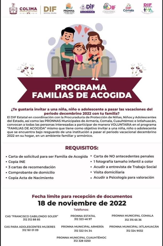 Resaltó que el acogimiento familiar busca dar cumplimiento a los derechos de igualdad sustantiva, no discriminación, inclusión, desarrollo, acceso a una vida libre de violencia, entre otros derechos que les fueron vulnerados por sus familias de origen, y por ello viven bajo el resguardo de una institución y dijo que el programa se lleva a cabo en coordinación con la Procuraduría de Protección de Niñas, Niños y Adolescentes (PRONNA) y los organismos pares en Armería, Comala, Cuauhtémoc e Ixtlahuacán.