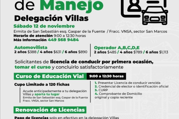 La Coordinación General de Delegaciones Urbanas y Rurales invita a la población a realizar el trámite de licencias de manejo que este sábado 12 de noviembre se llevará a cabo en la Delegación Villas.