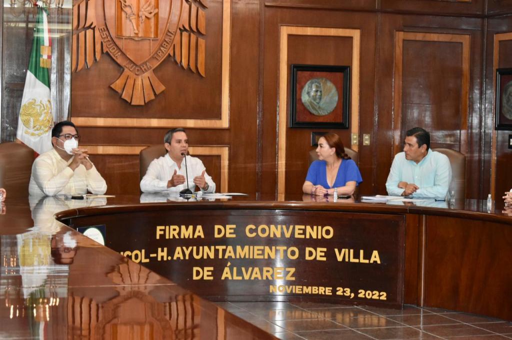 La Universidad de Colima y el Ayuntamiento de Villa de Álvarez firmaron un convenio de colaboración que en su fase inicial contempla la participación de la Máxima Casa de Estudios Colimense en la Estrategia Entornos Seguros, en la reapertura del módulo de la Cruz Roja en la colonia Villas de la Tuna y en una evaluación externa del primer año de gobierno municipal.