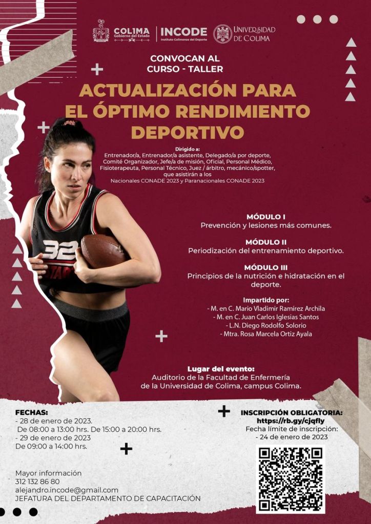 El Gobierno del Estado de Colima, a través del Instituto Colimense del Deporte (Incode), en coordinación con la Universidad de Colima, convocan al curso-taller de actualización para el óptimo rendimiento deportivo que se llevará a cabo durante dos días, el sábado 28 y domingo 29 de enero, con horario de 8:00 a 13:00 horas y de 15:00 a 20:00 horas, así como de 9:00 a 14:00 horas, en el auditorio de la Facultad de Enfermería de la Universidad de Colima, campus Colima.