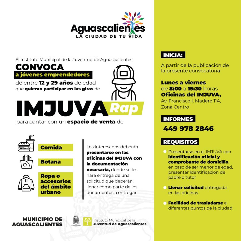 El Instituto Municipal de la Juventud de Aguascalientes (IMJUVA), invita a jóvenes emprendedores, de 12 a 29 años de edad, que estén interesados en participar como expositores en la gira de IMJUVARAP para contar con un espacio de venta de comida, botana, ropa o accesorios relacionados al ámbito urbano.