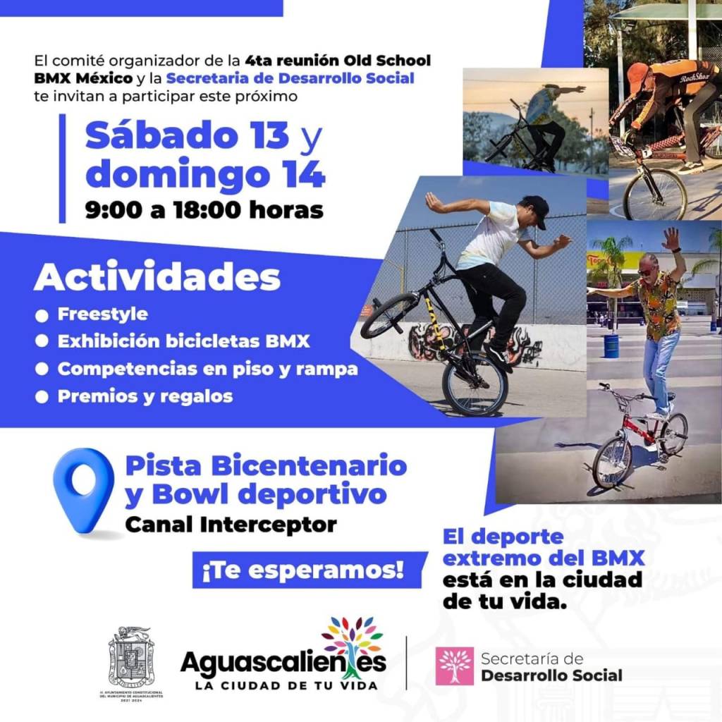 El comité organizador de la 4ta Reunión Old School BMX México y Secretaria de Desarrollo Social te invitan a participar con actividades de freestyle, exhibición bicicletas BMX, competencias en piso y rampa premios y regalos.