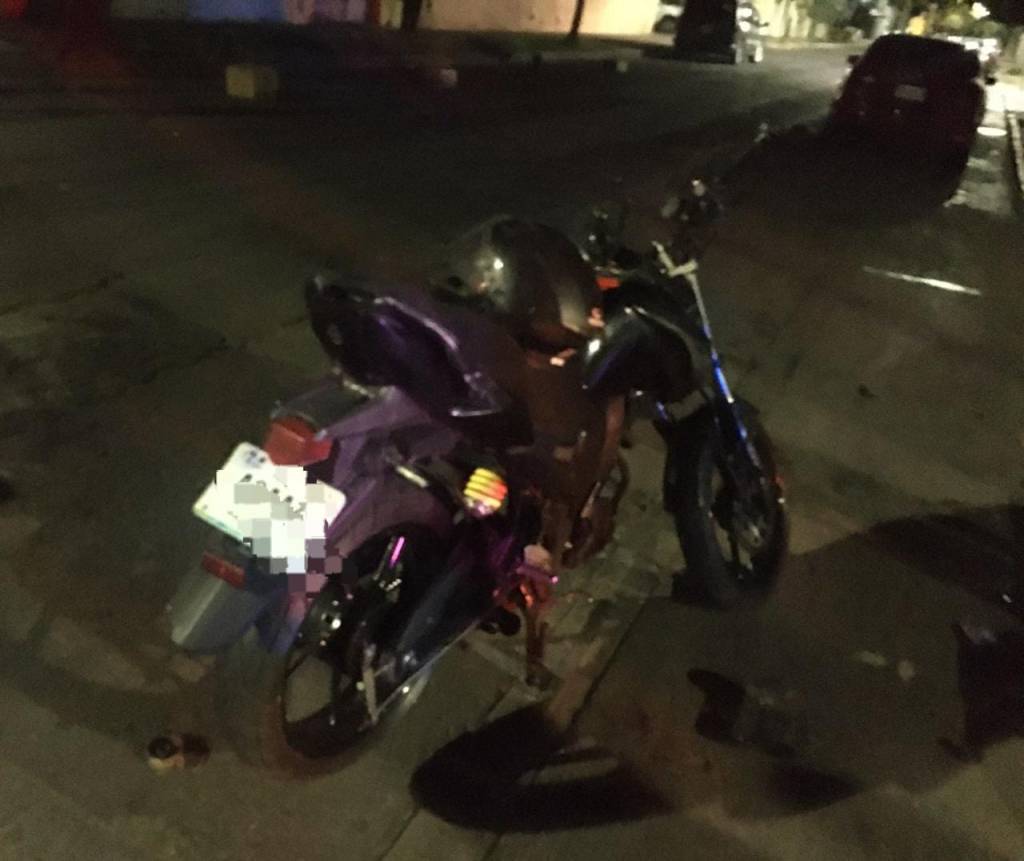Policías Viales de Aguascalientes atendieron el reporte de un choque desigual, entre una motocicleta y un vehículo tipo sedán, que tuvo lugar en calles del fraccionamiento San Pablo, durante la madrugada de este lunes.