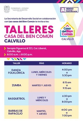 La Secretaría de Desarrollo Social (Sedeso) invita a las y los calvillenses a los talleres que se imparten en la Casa del Bien Común.