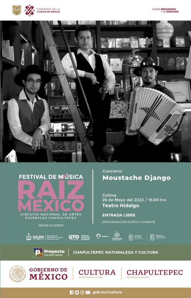 La Subsecretaría de Cultura del Gobierno del Estado de Colima y el Programa Federal Festival de Música: Raíz México invitan a toda la población para disfrutar de los conciertos de “Moustache Django” y “Cienfuegos”, que se llevarán a cabo en el teatro Hidalgo, en el centro histórico de la capital colimense este viernes 26 y sábado 27 de mayo, a partir de las siete de la tarde.