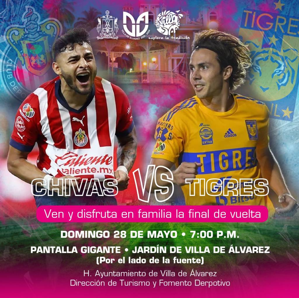 El Ayuntamiento de Villa de Álvarez, a través de la Dirección Municipal de Turismo, invita a la población en general a disfrutar de la Gran Final del futbol mexicano, entre los equipos Tigres de la UANL y las Chivas de Guadalajara en la Megapantalla Inflable que se instalará en la zona norte del Jardín Independencia, en el Centro de la ciudad.