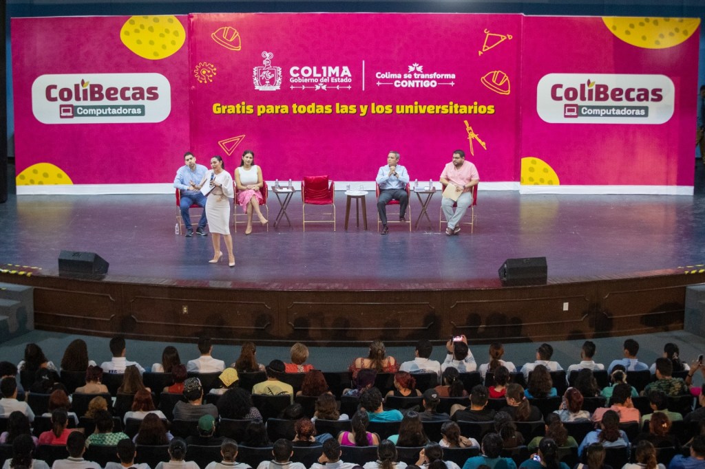Indira Vizcaíno y el rector de la Universidad de Colima, Christian Jorge Torres Ortiz Zermeño, se reunieron en el Paraninfo Universitario con centenares de estudiantes, donde la mandataria señaló que la creación de este programa como las distintas modalidades de ColiBecas Uniformes, Mochilas y Útiles Escolares, así como Computadoras gratuitas, “son posibles gracias a los ahorros que se han hecho en muchas áreas del mismo gobierno, para invertirlo en nuestras infancias y juventudes, que insisto, son nuestra prioridad».