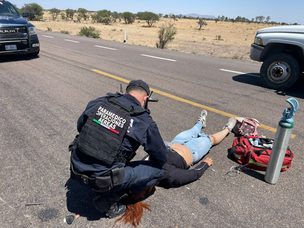 Paramédicos del Grupo de Operaciones Aéreas de la Policía Municipal de Aguascalientes, realizaron el traslado aeromédico de una paciente de sexo femenino que participó en un accidente de impacto contra objeto fijo al viajar en su motocicleta.