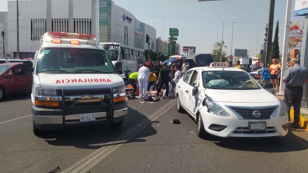 Aparatoso choque que se registró entre una motocicleta y un auto de alquiler dejó como saldo al motociclista lesionado de gravedad por lo que fue trasladado en código rojo a recibir atención médica al Hospital General de Zona número 1 del IMSS.
