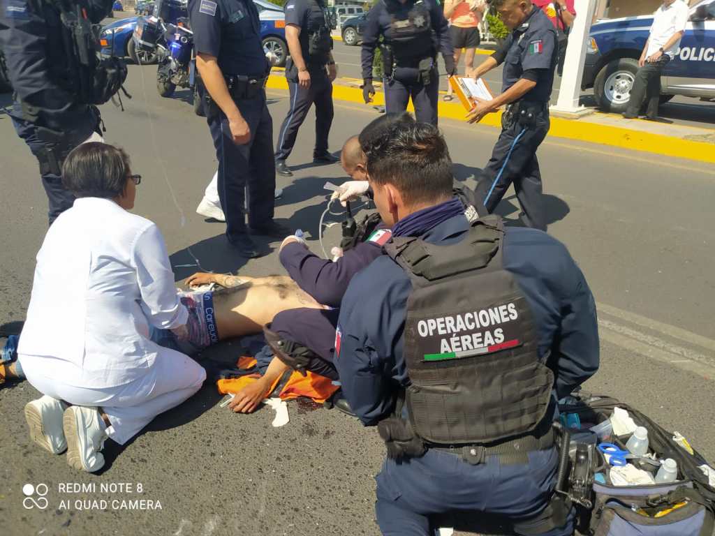 El motociclista recibió los primeros auxilios de los policías con conocimientos en emergencias médicas del Grupo de Operaciones Aéreas, detectando que presentaba probable traumatismo canoencefálico severo, neumotórax y trauma abdominal así como probable fractura de pelvis, por lo que fue trasladado en coordinación con paramédicos de la ambulancia ECO-433 del ISSEA a recibir atención médica en código rojo al Hospital General de Zona número 1 del IMSS.