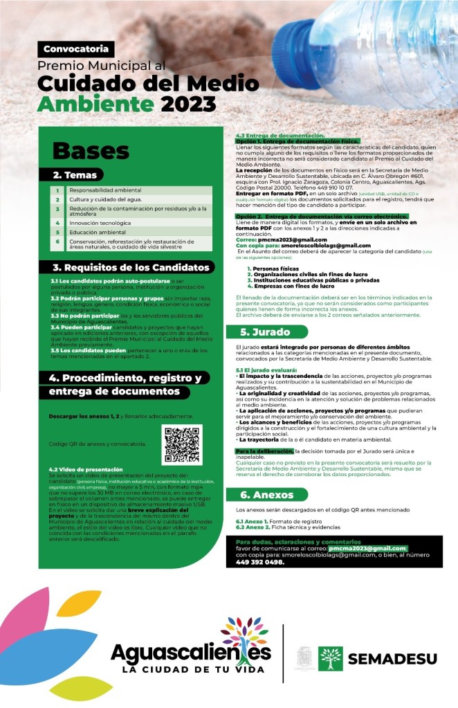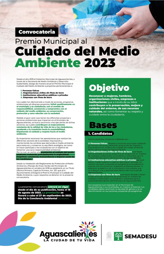Como parte de las actividades por el Día Mundial del Medio Ambiente que se celebra cada 5 de junio, el Municipio de Aguascalientes, presentó la convocatoria del Premio Municipal al Cuidado del Medio Ambiente 2023, a través del cual se busca reconocer las acciones y proyectos que contribuyen al cuidado del medio ambiente, conservación de la biodiversidad y al desarrollo sustentable, con un sentido de responsabilidad, constancia, compromiso y que ayude a la protección del entorno.