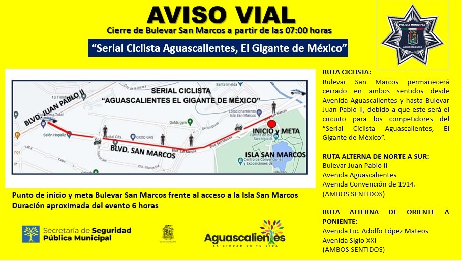 La Secretaría de Seguridad Pública Municipal de Aguascalientes informa que con motivo del “Serial Ciclista Aguascalientes, El Gigante de México” que se realizará este domingo 25 de junio, habrá cierres de circulación en las inmediaciones de Bulevar San Marcos.