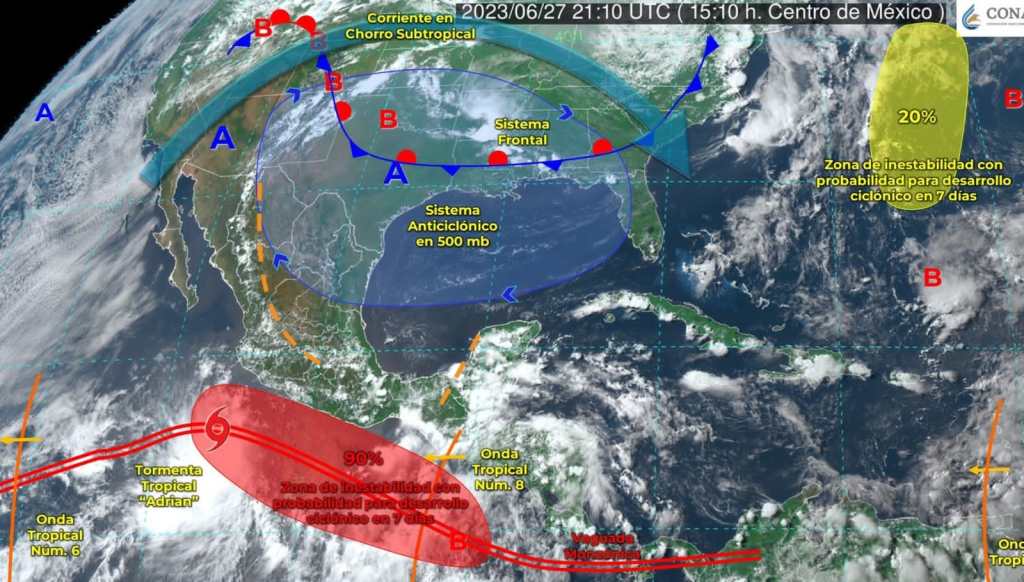 La Comisión Nacional del Agua (Conagua), fuente oficial del Gobierno de México, informó que el centro de la Tormenta Tropical «Adrian» se localizó a 430 kilómetros al suroeste de Punta San Telmo, Michoacán, con vientos máximos sostenidos de 75 km/h, rachas de 95 km/h y desplazamiento hacia el oeste a 24 km/h.