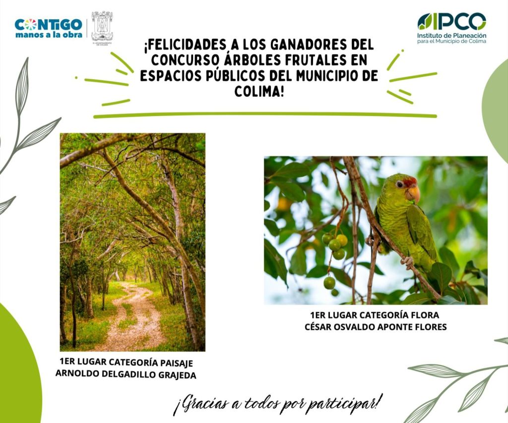 Tras la participación de 34 fotógrafos, concluyó la fase de elección de las imágenes ganadoras del ‘Concurso de fotografía de árboles frutales en espacios públicos del municipio de Colima’, siendo elegidas las fotografías presentadas por César Osvaldo Aponte Flores, en la categoría de ‘flora’ y Arnoldo Delgadillo Grajeda en la categoría de ‘paisaje’ tras la evaluación del jurado calificador.