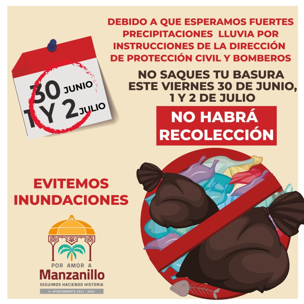 El Ayuntamiento de Manzanillo, a través de la dirección de Protección Civil y Bomberos, informa que derivado del pronóstico emitido por el Sistema Meteorológico Nacional sobre el Fenómeno Perturbador denominado “Perturbación Tropical #Dos-E”, se espera que tenga un desplazamiento que afecte en las próximas horas a las costas colimenses, es por ello, que deberán abstenerse de realizar actividades tipo al aire libre. Por ese mismo motivo, la dirección de Servicios Públicos informó que quedará suspendida la recolección de basura, este viernes, sábado y domingo.
