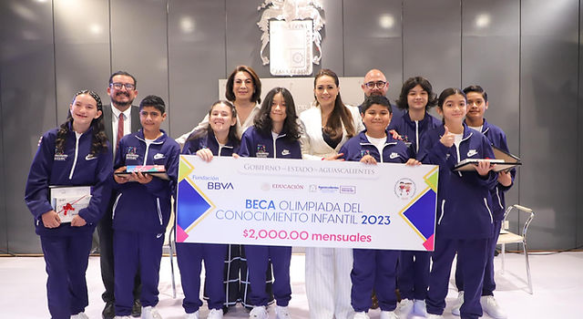 La gobernadora Tere Jiménez y la Fundación BBVA reconocieron el esfuerzo de los ocho estudiantes que obtuvieron los mejores promedios en la Olimpiada del Conocimiento Infantil Aguascalientes 2023, entre más de 25 mil 400 participantes; a ellos se les entregarán becas mensuales de 2 mil pesos que recibirán durante los tres años que cursen la secundaria, estos apoyos podrán ampliarse a otros niveles académicos si continúan con un promedio mínimo de ocho, pudiendo llegar hasta la universidad.