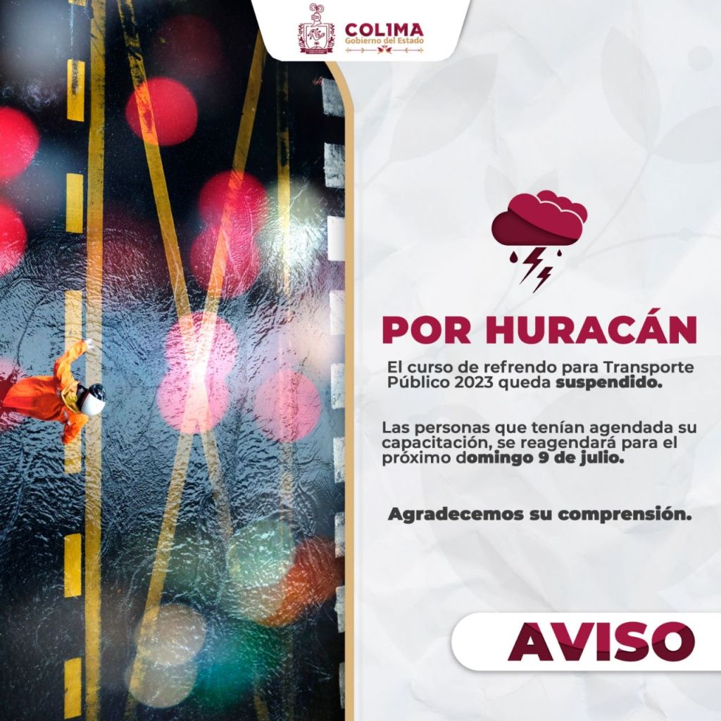 El Gobierno del Estado de Colima, a través de la Subsecretaría de Movilidad (Subsemov), informa a las conductoras y conductores de transporte público colectivo que, debido al Huracán ‘Beatriz’ en el Pacífico Centro, se decidió suspender la capacitación para relativa al refrendo 2023, programada para este este sábado 1 de julio.