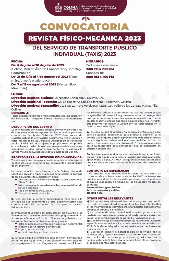 La revisión físico-mecánica empezará en la zona metropolitana Colima-Villa de Álvarez, e incluye a los municipios de Cuauhtémoc, Coquimatlán y Comala. La revisión física será del 5 al 28 de julio del 2023 de lunes a viernes de 3:00 a 7:00 de la tarde, y los sábados de 8:00 de la mañana a 1:00 de la tarde. Para participar en esta revisión es necesario haber acudido previamente a la Subsecretaría de Movilidad dentro de los plazos establecidos, para entregar en copia los siguientes documentos: constancia de Clave Única de Registro de Concesiones (Clave CURC), póliza de seguro de cobertura amplia y responsabilidad de daños a terceros, comprobante de pago del revalidado 2022/2023 y comprobante de domicilio.