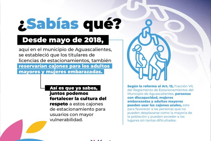 La Dirección de Mercados, Estacionamientos y Áreas Comerciales, comprometida con la inclusión y cultura de la discapacidad supervisa la adecuada prestación del servicio a los usuarios de los estacionamientos públicos e informa a la ciudadanía que desde la reforma en mayo del 2018 al Reglamento de Estacionamientos del Municipio de Aguascalientes, se estableció la obligación de reservar cajones a los titulares de
