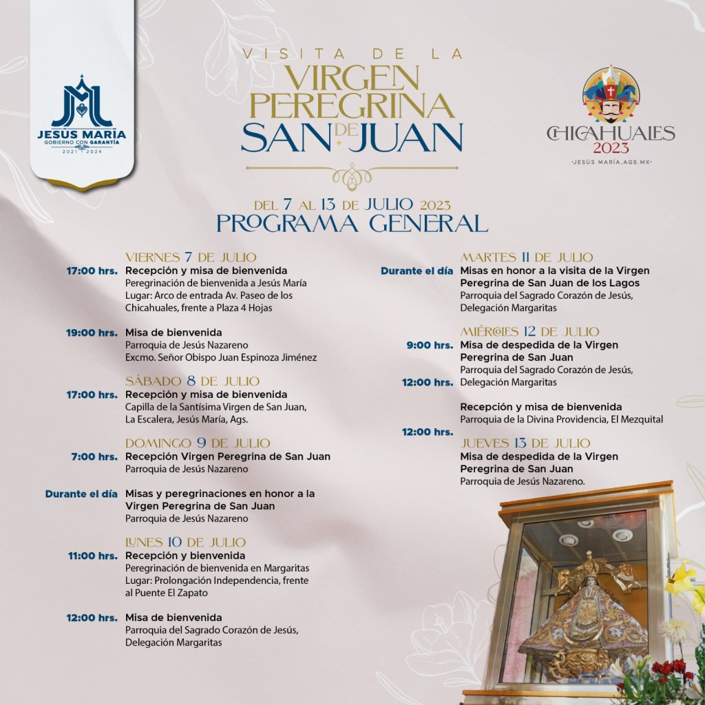 Como ya se ha hecho tradición en el Municipio de Jesús María y en la víspera de la Feria de los Chicahuales, este viernes 7 de julio se espera la llegada de la Virgen Peregrina de San Juan de los Lagos, que estará de visita hasta el 13 de julio.