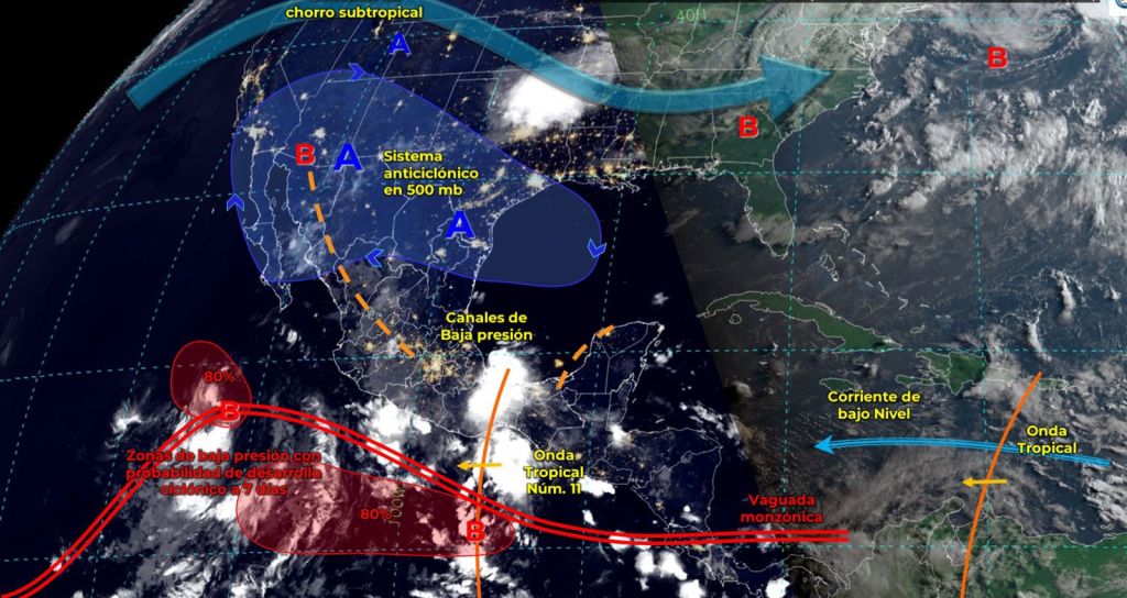 De acuerdo con el reporte del Servicio Meteorológico Nacional (SMN), su amplia circulación ocasionará lluvias fuertes a muy fuertes acompañadas de descargas eléctricas en Baja California Sur y el occidente del país, además de rachas de viento de 50 a 70 km/h y oleaje de 2 a 4 metros de altura en las costas de Baja California Sur, Nayarit, Jalisco y Colima.