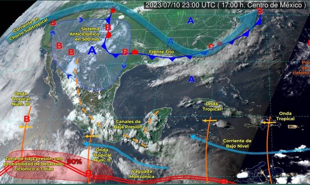 Para este 11 de julio, el organismo de la Comisión Nacional del Agua (Conagua), estima temperaturas de hasta 45 grados Celsius en Baja California, Sonora, Chihuahua, Coahuila, Nuevo León y Tamaulipas; de 35 a 40°C en Baja California Sur, Sinaloa, Nayarit, Durango, San Luis Potosí, Veracruz, Tabasco, Campeche, Yucatán y Quintana Roo; mientras que Colima, Jalisco, Michoacán, Guerrero, Zacatecas, Aguascalientes, Guanajuato, Querétaro, Hidalgo, Puebla (suroeste), Morelos, Oaxaca y Chiapas registros de entre 30 y 35°C.