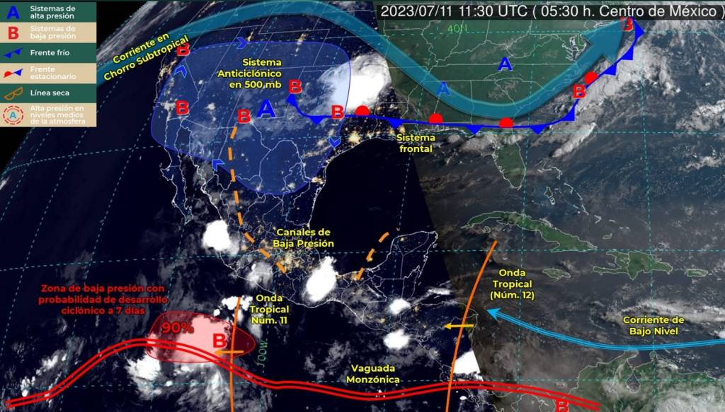 Para hoy se prevé en el Pacífico Centro cielo nublado la mayor parte del día, con lluvias puntuales muy fuertes en Nayarit, Jalisco y Michoacán, así como lluvias fuertes en Colima, con descargas eléctricas y posible caída de granizo, lo que podría incrementar los niveles de ríos y arroyos, y generar deslaves e inundaciones en zonas bajas.