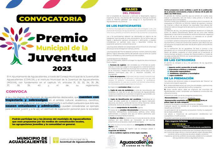 El Ayuntamiento de la Capital a través del Instituto Municipal de la Juventud de Aguascalientes (Imjuva) invita a participar en la Convocatoria al Premio Municipal de la Juventud 2023.