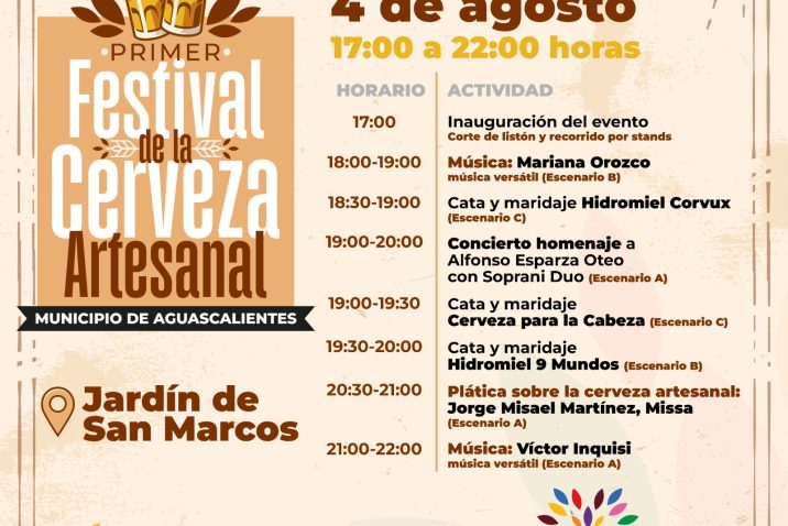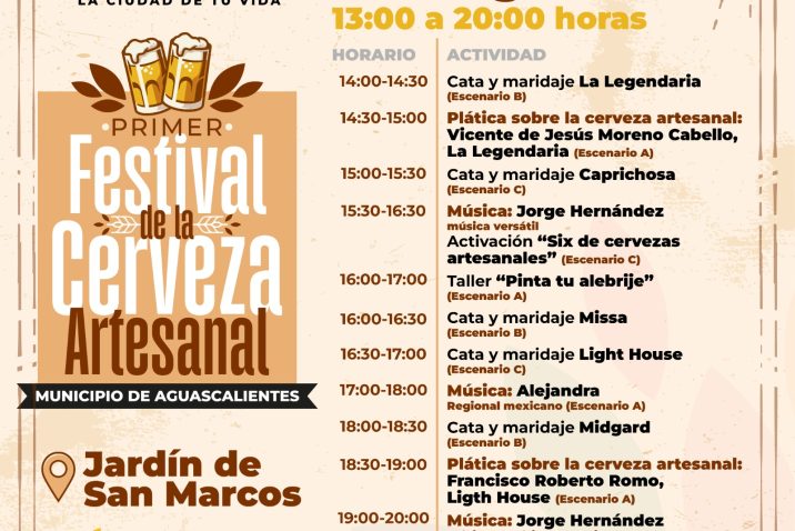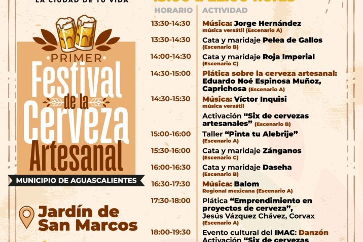Además, comentó que se llevarán a cabo actividades culturales como música en vivo, talleres infantiles, y danza, por parte del Instituto Municipal para la Cultura (IMAC), así como apoyo por parte del Instituto Municipal de la Juventud de Aguascalientes (IMJUVA), catas y maridajes, gastronomía diversa, y pláticas sobre la cerveza artesanal.