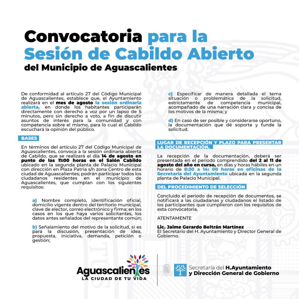 El H. Ayuntamiento de Aguascalientes da voz a la ciudadanía y convoca a participar en la Sesión Ordinaria Abierta de Cabildo el lunes 14 de agosto a las 11:00 horas en salón Cabildo de Palacio Municipal.
