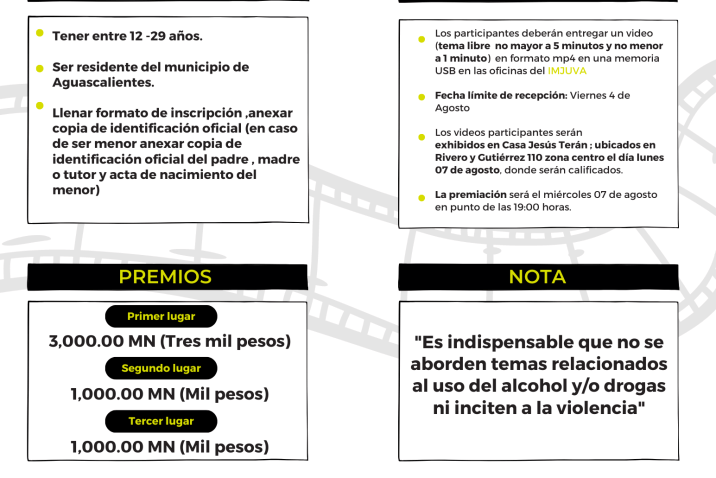 El Instituto Municipal de la Juventud de Aguascalientes (Imjuva) y el Instituto Municipal Aguascalentense para la Cultura (Imac), invitan a jóvenes de entre 12 y 29 años de edad, a participar en el primer concurso de clips de video “Cine en corto”.