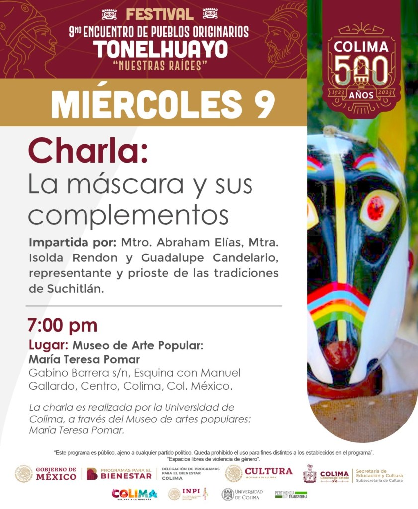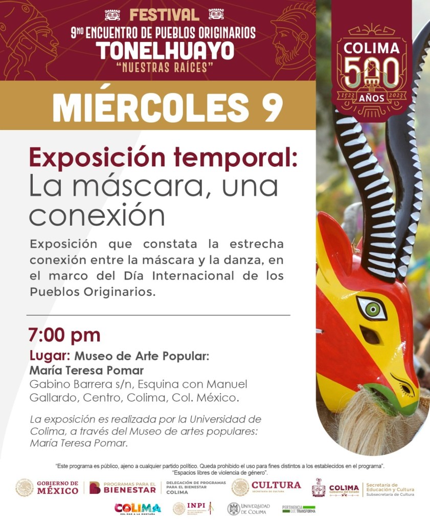 Este miércoles, en el Museo de Arte Popular María Teresa Pomar de la Universidad de Colima, en la capital colimense, continúan las actividades artísticas, culturales y académicas del Noveno Encuentro de Pueblos Originarios Festival Tonelhuayo, Nuestras Raíces, organizado por la Subsecretaría de Cultura del Gobierno del Estado, el Instituto de Pueblos Indígenas y los portadores del patrimonio; se trata de una exposición temporal, acompañada de una charla académica sobre la historia y elementos que rodean a la Danza de los Morenos de Suchitlán.