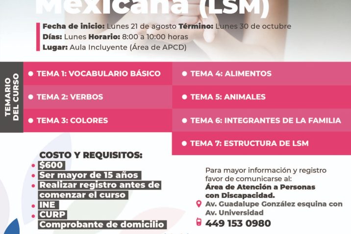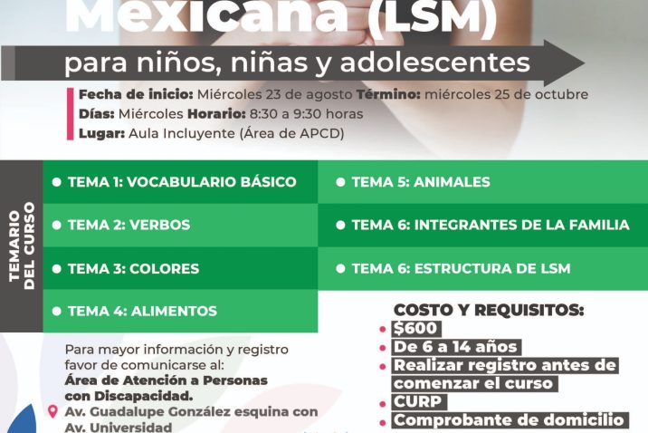Con el objetivo de promover la inclusión de las personas con discapacidad, el DIF Municipal de Aguascalientes iniciará tres cursos básicos de Lengua de Señas Mexicana (LSM), el primero a nivel inicial, el segundo nivel avanzado y en esta ocasión menores de 6 a 14 años de edad, tendrán la oportunidad de aprender LSM con el inicio de un nuevo curso a nivel básico infantil.