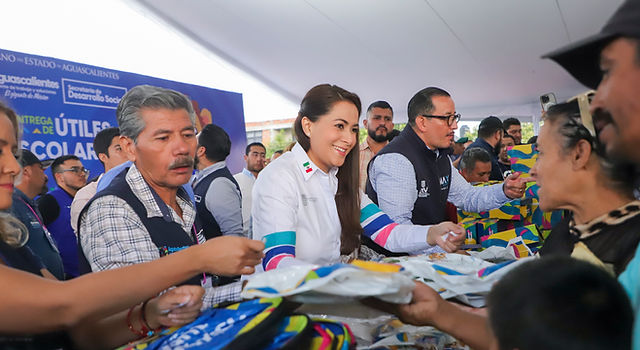 La gobernadora de Aguascalientes, Tere Jiménez, continúa con la entrega de apoyos escolares. Este día visitó la colonia Palomino Dena y Villas de Nuestra Señora de la Asunción, donde entregó útiles, zapatos, tenis y mochilas a las y los estudiantes de educación básica de estas colonias.