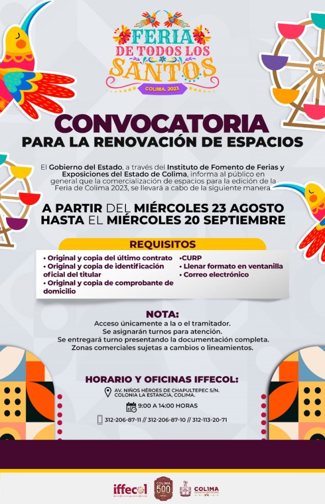 Desde este miércoles 23 de agosto y hasta el 20 de septiembre del presente año es el periodo improrrogable para que las personas interesadas en contar con un espacio comercial en las instalaciones de la Feria de Todos los Santos 2023, puedan realizar sus trámites para renovar el permiso para establecerse en dichos locales, dio a conocer el director del Instituto de Fomento de Ferias y Exposiciones del Estado de Colima (Iffecol), Rodolfo Aguilar Dávalos.