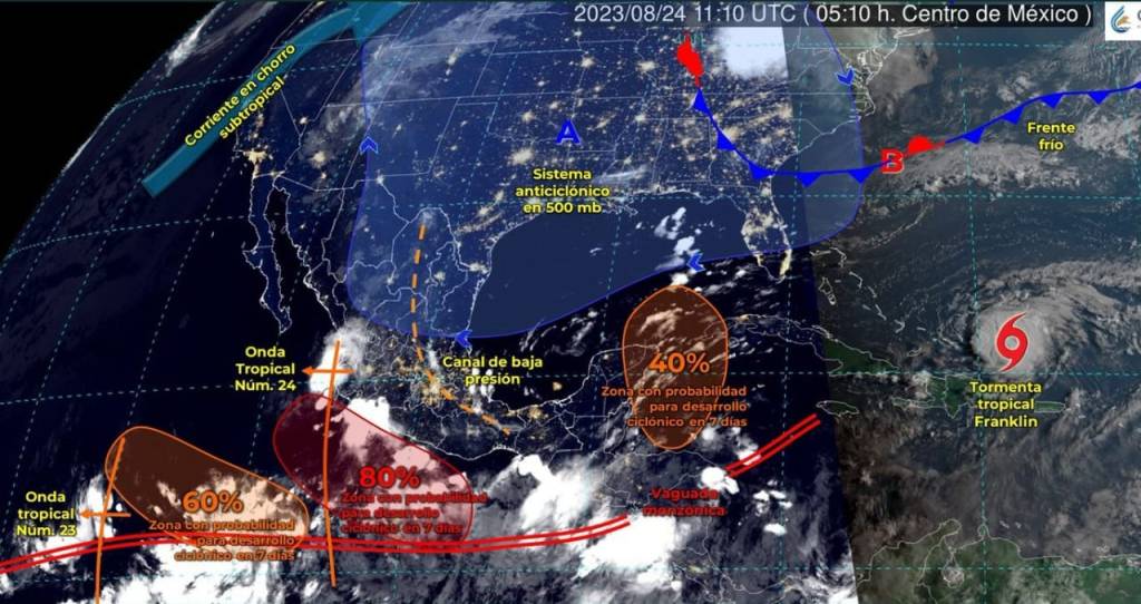 La Unidad Estatal de Protección Civil (UEPC) del Gobierno del Estado de Colima, continúa con la vigilancia de la onda tropical número 24, pues hoy jueves se ubica al suroeste de las costas de Jalisco, propiciando chubascos y lluvias fuertes acompañadas de descargas eléctricas y rachas de viento en el occidente mexicano, con lluvias puntuales muy fuertes en Colima; este fenómeno continuará desplazándose hacia el oeste, dejando de afectar al país al final del día.