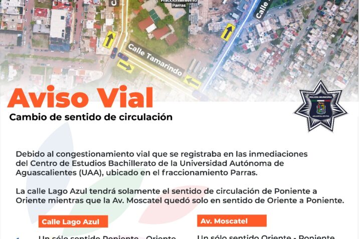 El Municipio de Aguascalientes a través de la Dirección de Movilidad de la Secretaría de Seguridad Pública Municipal (SSPM), trabaja en cambios de circulación vehicular para que las calles Moscatel y Lago Azul ahora sean de un solo sentido y esto permita facilitar el tránsito para los alrededores del Centro de Educación Media UAA Bachillerato Central (BACHUAA), ubicada en el fraccionamiento Parras.