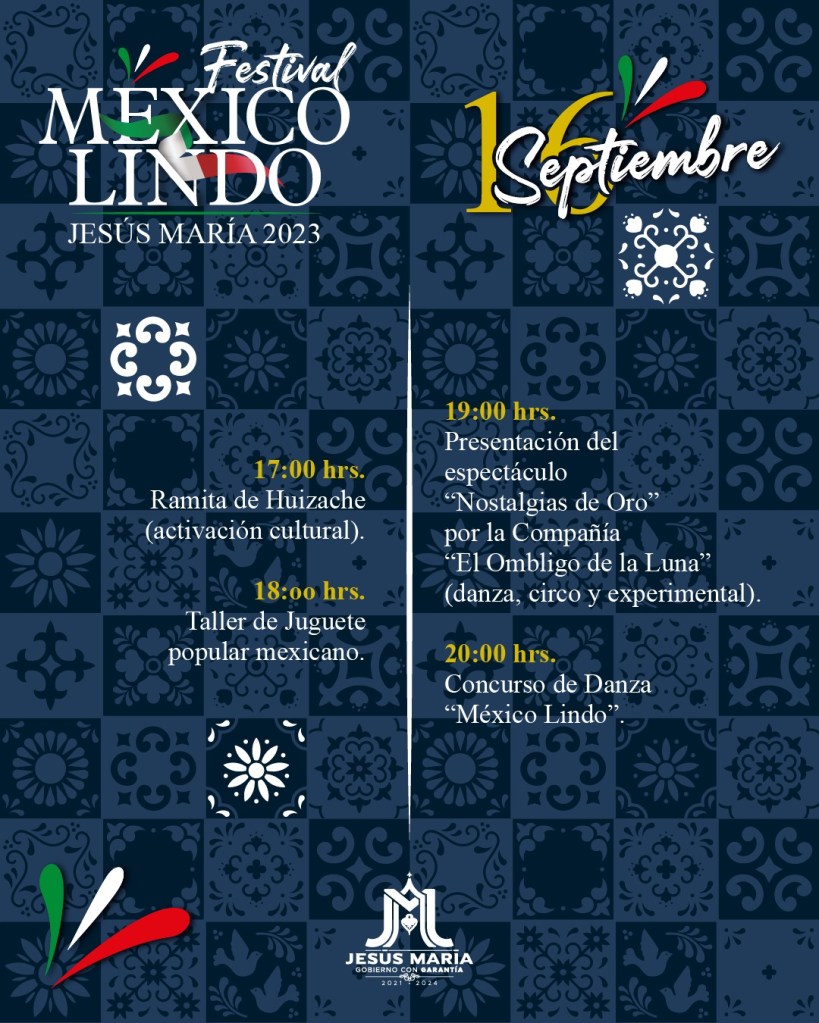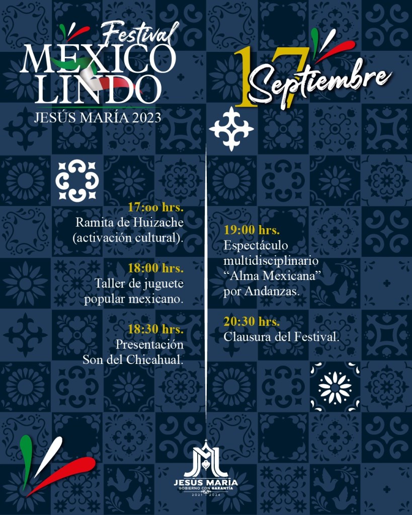 Con motivo de las fiestas patrias y para arraigar entre la población las tradiciones mexicanas, el Municipio de Jesús Marías, a través de la Instancia de Cultura, prepara el Festival México Lindo 2023 a realizarse del 15 al 17 de septiembre, informó Flor Zavala Soto.