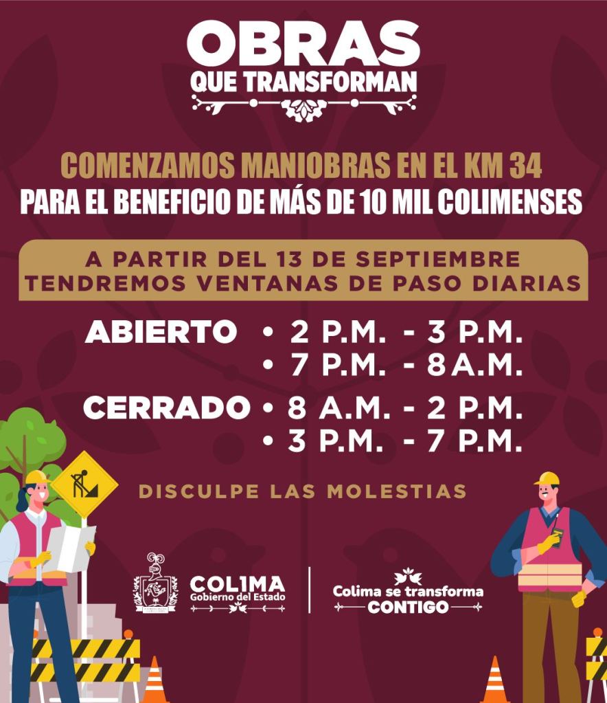 El Gobierno del Estado de Colima, a través de la Secretaría de Infraestructura, Desarrollo Urbano y Movilidad (Seidum), informa a toda la población que, a partir del próximo miércoles 13 de septiembre, iniciarán las maniobras para la rehabilitación del kilómetro 34 de la carretera Villa de Álvarez-Minatitlán, para que las personas usuarias de esta vía lo tengan presente.